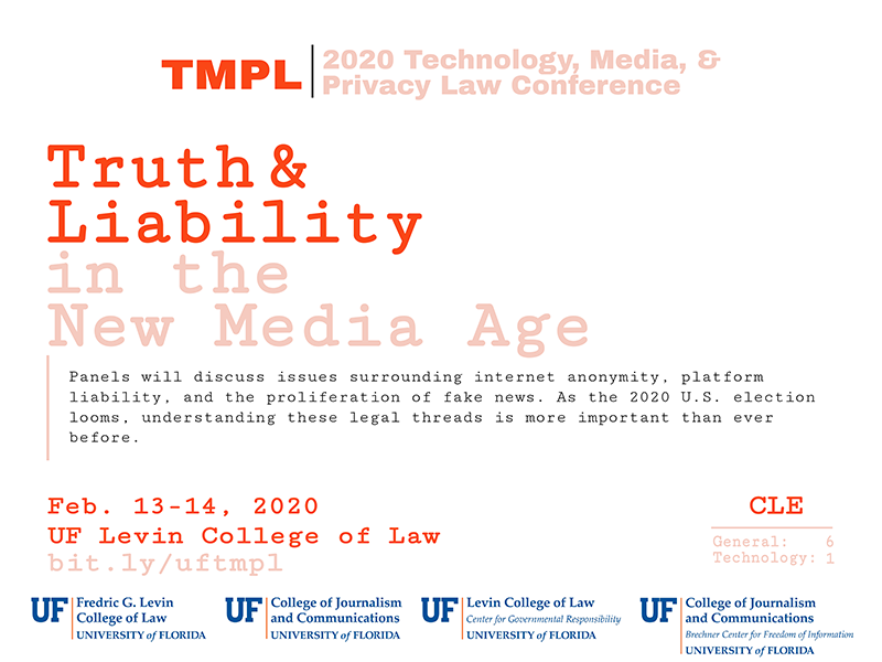 The Technology, Media & Privacy Law Conference addresses how technological advancements are reshaping privacy and free speech issues in the fields of law, journalism, and public policy. The 2020 TMPL Conference will consist of panel discussions on fake news and new media, Internet anonymity as a weapon or a right, platform liability and the role of social media platforms in hate speech versus free speech, and global comparisons on liability, anonymity, and fake news. The TMPL conference is hosted by the Center for Governmental Responsibility (CGR) at the UF Levin College of Law and the Brechner Center for Freedom of Information at the UF College of Journalism and Communications.
