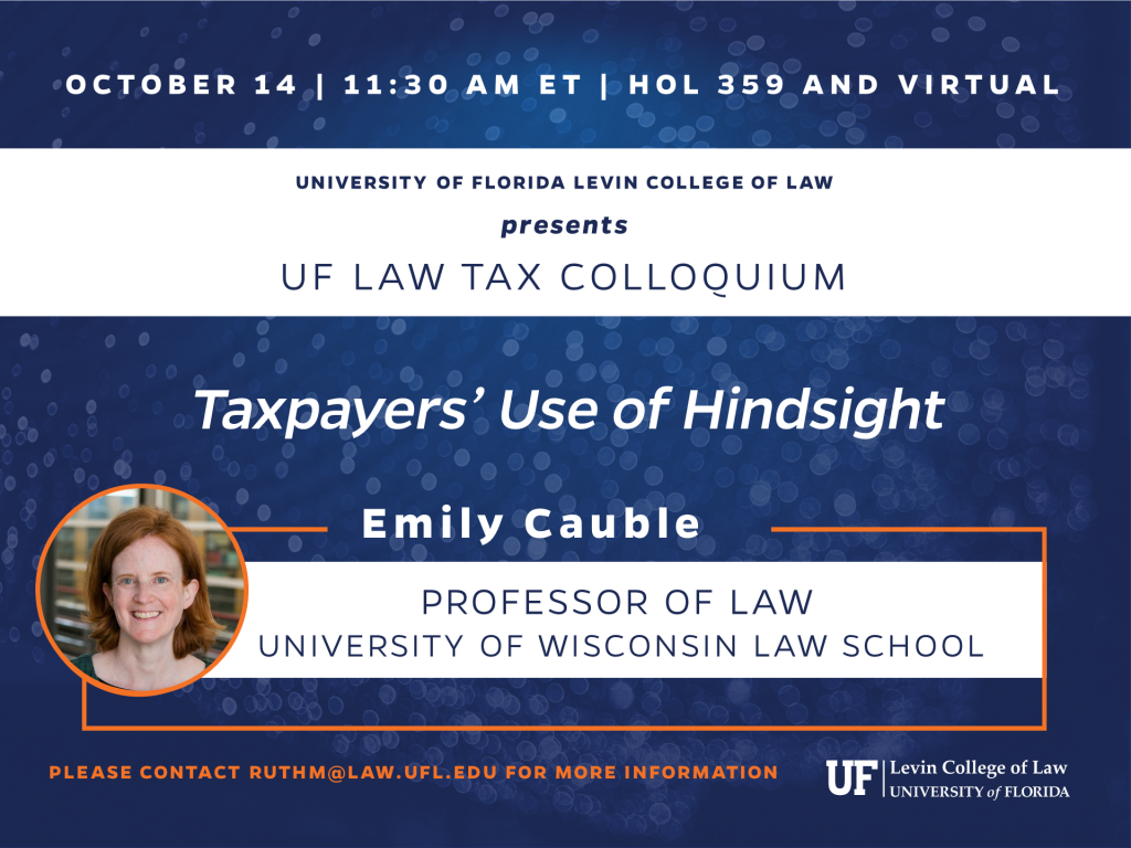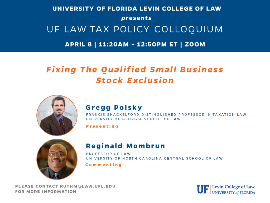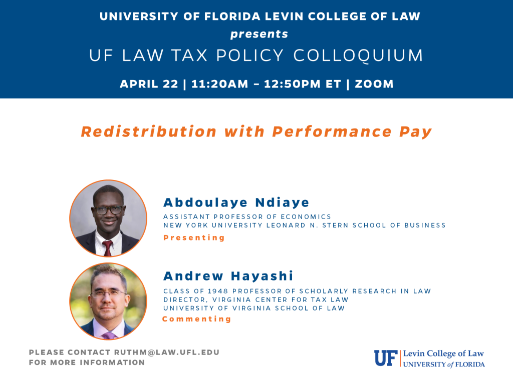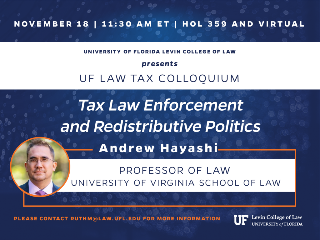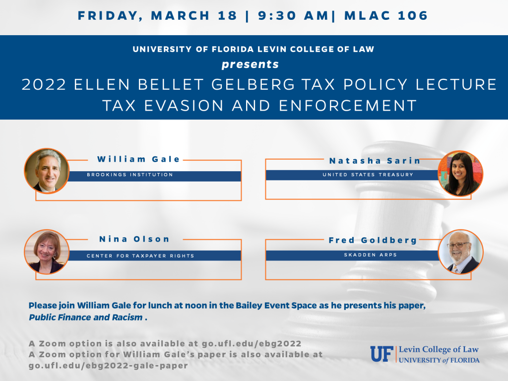 Please join William G. Gale, Arjay and Frances Fearing Miller Chair in Federal Economic Policy, Brookings Institution; Fred T. Goldberg, Jr., Of Counsel, Tax, Skadden, Arps, Slate, Meagher, & Flom LLP; Nina Olsen, Executive Director, Center for Taxpayer Rights; and Natasha Sarin, Deputy Assistant Secretary for Economic Policy, United States Treasury Department; as they discuss Tax Evasion and Enforcement from 9:30 a.m. to 11:30a.m. William Gale will present his paper, Public Finance and Racism from noon – 1:30 p.m. Please contact ruthm@law.ufl.edu for more information.
