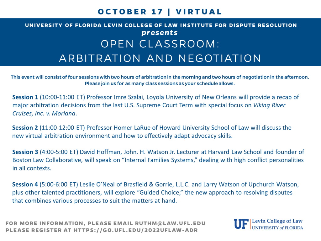 The University of Florida Levin College of Law Institute for Dispute Resolution presents a four session Open Classroom, presented by Senior Legal Skills Professor Joan Sterns Johnsen. This event will consist of four sessions with two hours of arbitration in the morning and two hours of negotiation in the afternoon. Please join for as many class sessions as your schedule allows. Session 1 (10:00-11:00 ET) Professor Imre Szalai, Loyola University of New Orleans will provide a recap of major arbitration decisions from the last U.S. Supreme Court Term with special focus on Viking River Cruises, Inc. v. Moriana. Session 2 (11:00-12:00 ET) Professor Homer LaRue of Howard University School of Law will discuss the new virtual arbitration environment and how to effectively adapt advocacy skills. Session 3 (4:00-5:00 ET) David Hoffman, John. H. Watson Jr. Lecturer at Harvard Law School and founder of Boston Law Collaborative, will speak on “Internal Families Systems,” dealing with high conflict personalities in all contexts. Finally, Session 4 (5:00-6:00 ET) Leslie O’Neal of Brassfield Gorrie and Larry Watson of Upchurch Watson, plus other talented practitioners, will explore “Guided Choice,” the new approach to resolving disputes that combines various processes to suit the matters at hand. Please contact ruthm@law.ufl.edu for more information.