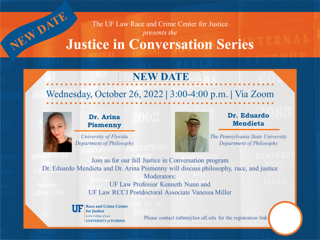 Please join the University of Florida Levin College of Law Race and Crime Center for Justice for our fall Justice in Conversation Series. Dr. Eduardo Mendieta, Professor of Philosophy and Latina/o Studies, Pennsylvania State University College of the Liberal Arts, and Dr. Arina Pismenny, Lecturer in Philosophy, University of Florida College of Liberal Arts and Sciences, will lead a conversation on Philosophy, Race, and Justice. Kenneth Nunn, Dr. Patricia Hilliard-Nunn Memorial Racial Justice Term Professor and Professor of Law, University of Florida Levin College of Law; and Vanessa Miller, RCCJ Post-Doctoral Associate, will moderate. Please contact ruthm@law.ufl.edu for more information.