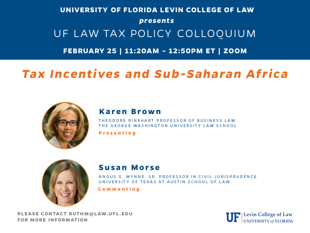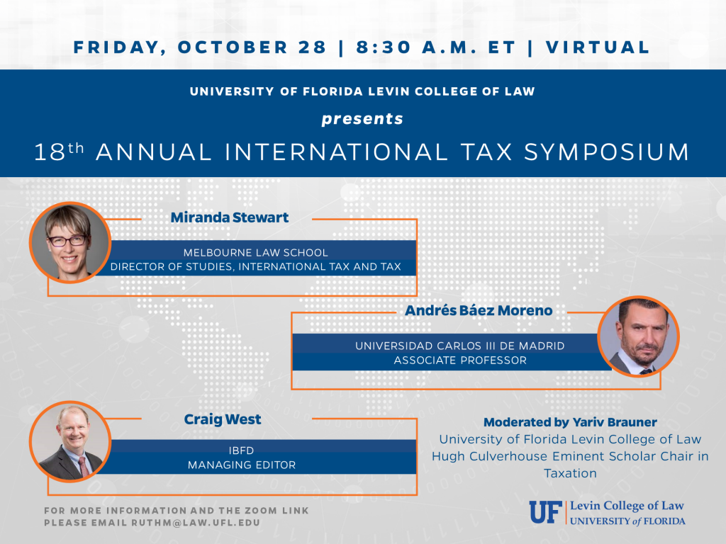 The University of Florida Levin College of Law and the Graduate Tax Program presents the 18th Annual International Tax Symposium. Please join presenters Andrés Báez Moreno, Associate Professor of Tax Law at Universidad Carlos III de Madrid; Miranda Stewart, Director of Studies, International Tax and Tax, University of Melbourne Law School; and Craig West, Managing Editor, IBFD, and Adjunct Professor, University of Cape Town. Yariv Brauner, Hugh Culverhouse Eminent Scholar Chair in Taxation, University of Florida Levin College of Law, moderates. Please contact ruthm@law.ufl.edu for more information and the Zoom link.