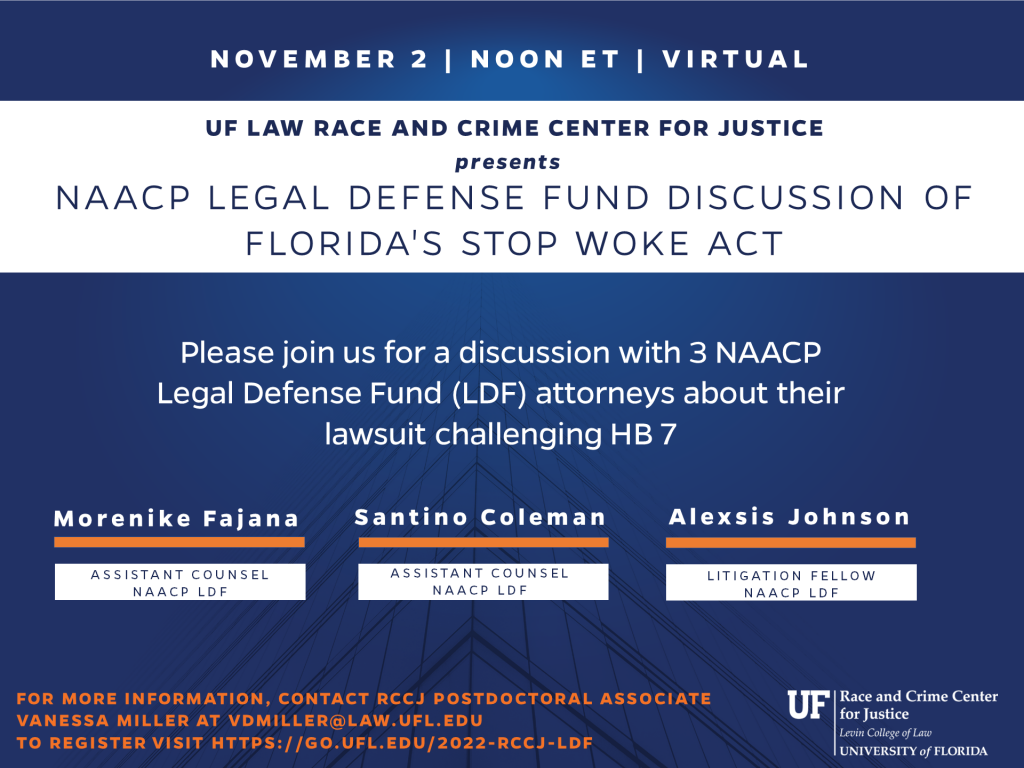 Please join us for a discussion with 3 NAACP Legal Defense Fund (LDF) attorneys about their lawsuit challenging HB 7. Morenike Fajana, Assistant Counsel, NAACP LDF; Santino Coleman, Assistant Counsel, NAACP LDF; and Alexsis Johnson, Litigation Fellow, NAACP LDF; present.