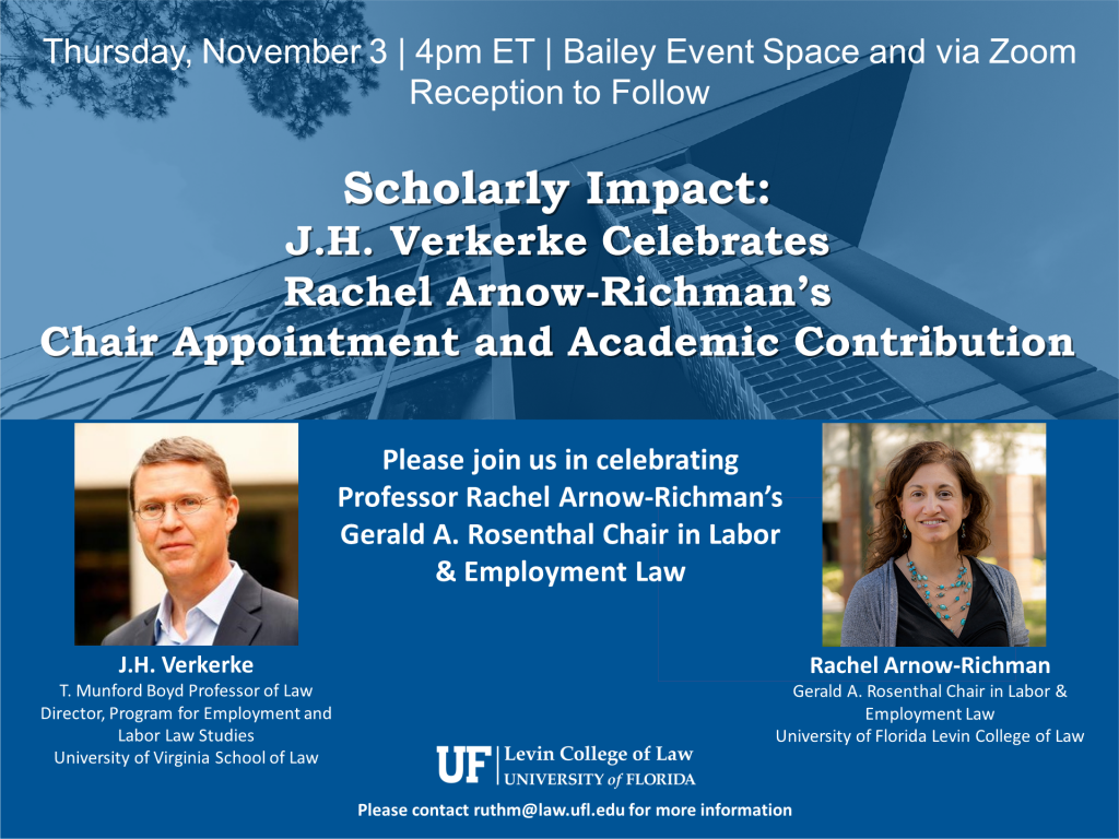 Please join J.H. “Rip” Verkerke, T. Munford Boyd Professor of Law and Director, Program for Employment and Labor Law Studies, University of Virginia School of Law; as he celebrates University of Florida Levin College of Law Professor Rachel Arnow-Richman’s Gerald A. Rosenthal Chair in Labor & Employment Law. Professor Arnow-Richman will also provide remarks, followed by an opportunity for Q&A. You may join the event via Zoom. Please contact ruthm@law.ufl.edu for more information.