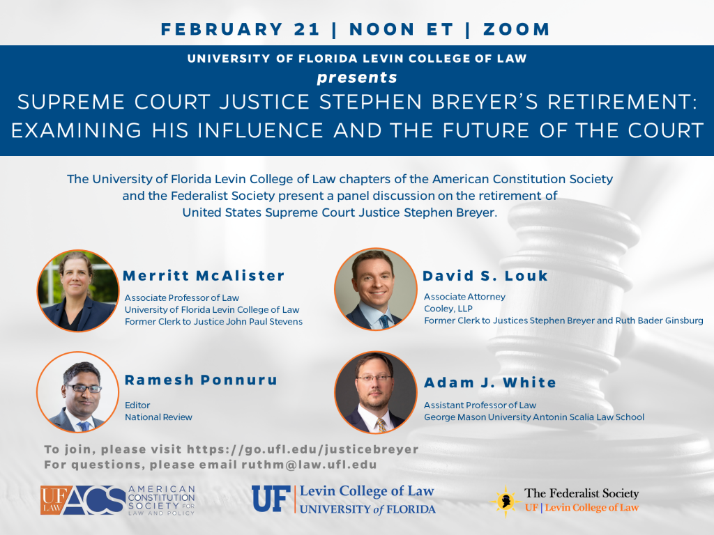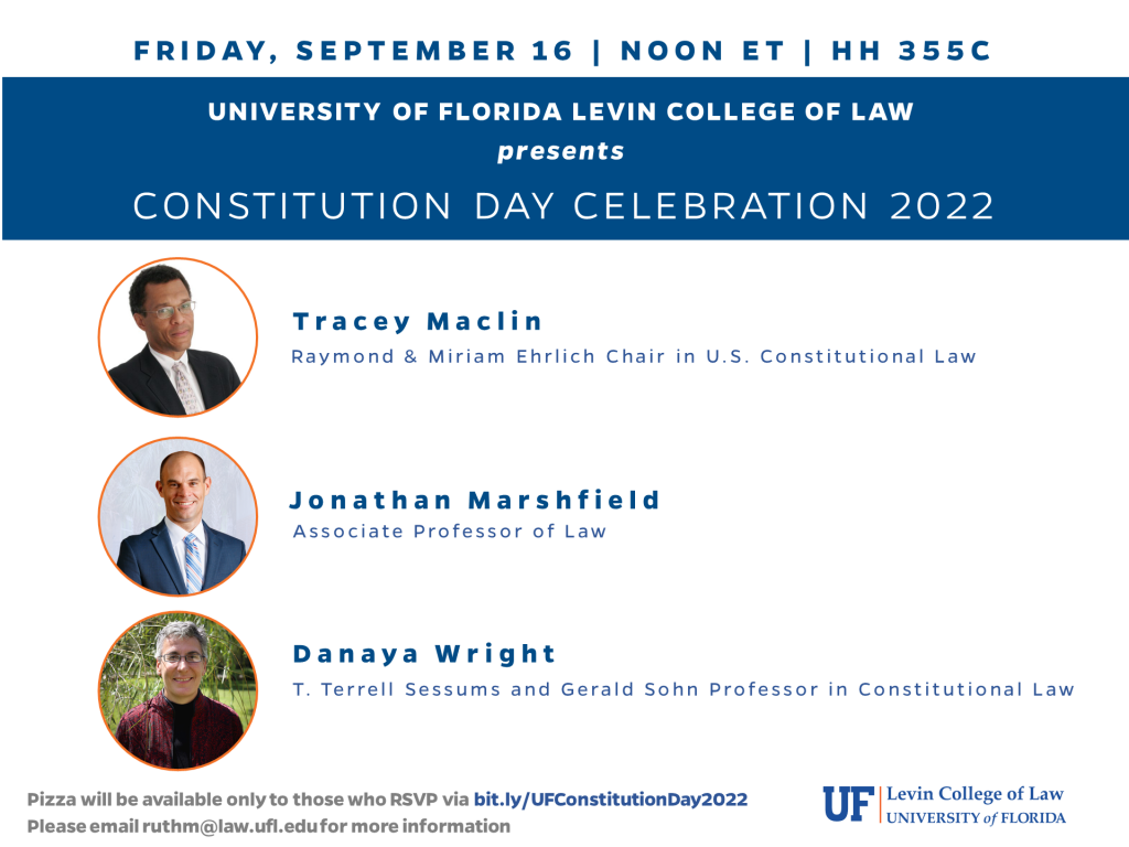 Please join University of Florida Levin College of Law professors Tracey Maclin, Raymond & Miriam Ehrlich Chair in U.S. Constitutional Law; Jonathan Marshfield, Associate Professor of Law; and Danaya Wright, T. Terrell Sessums and Gerald Sohn Professor of Constitutional Law and Co-Director, Center for Governmental Responsibility; for our 2022 Constitution Day Celebration. Please contact ruthm@law.ufl.edu for more information. You may RSVP here.