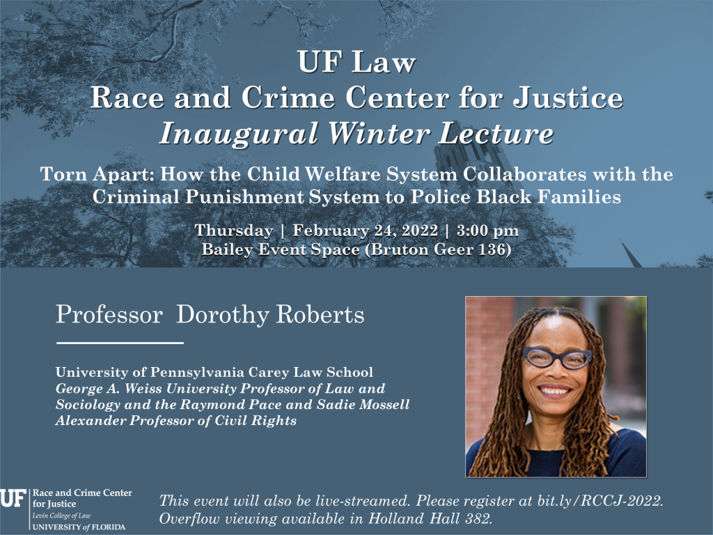 Dorothy E. Roberts, George A. Weiss University Professor of Law and Sociology and the Raymond Pace and Sadie Tanner Mossell Alexander Professor of Civil Rights, University of Pennsylvania Carey Law School, presents Torn Apart: How the Child Welfare System Collaborates with the Criminal Punishment System to Police Black Families. Please contact ruthm@law.ufl.edu for more information.