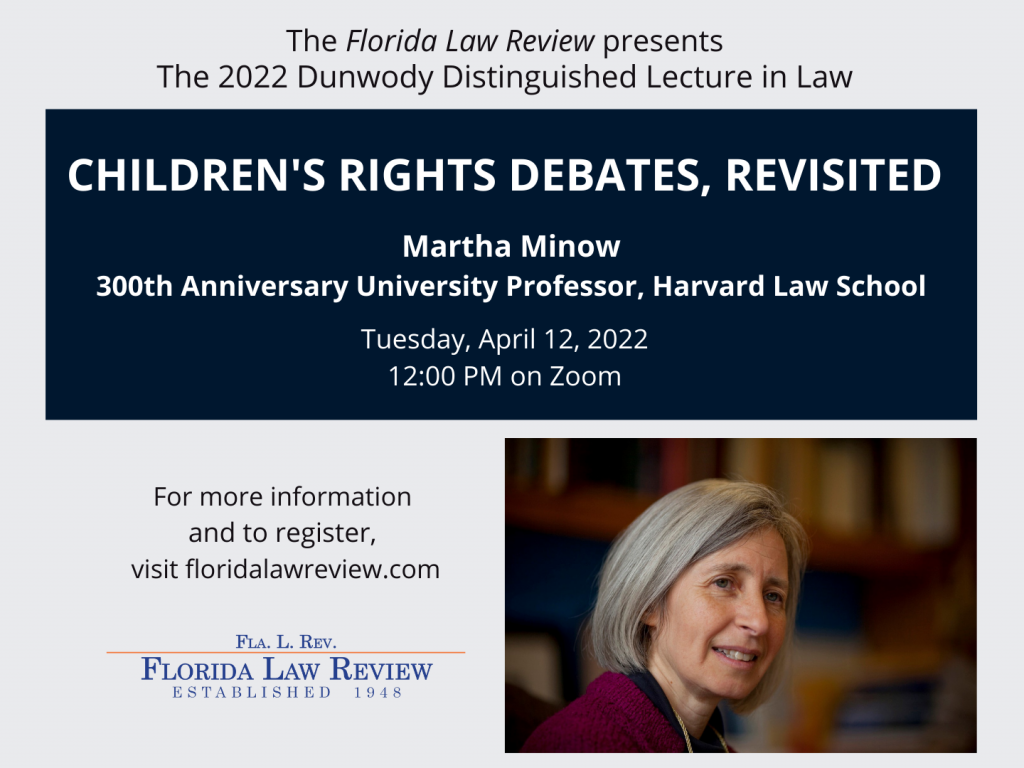 The Florida Law Review presents the annual Dunwody Distinguished Lecture. Martha Minow, 300th Anniversary University Professor and former Dean, Harvard Law School, delivers Children’s Rights Debates, Revisited. Please contact ruthm@law.ufl.edu for more information.