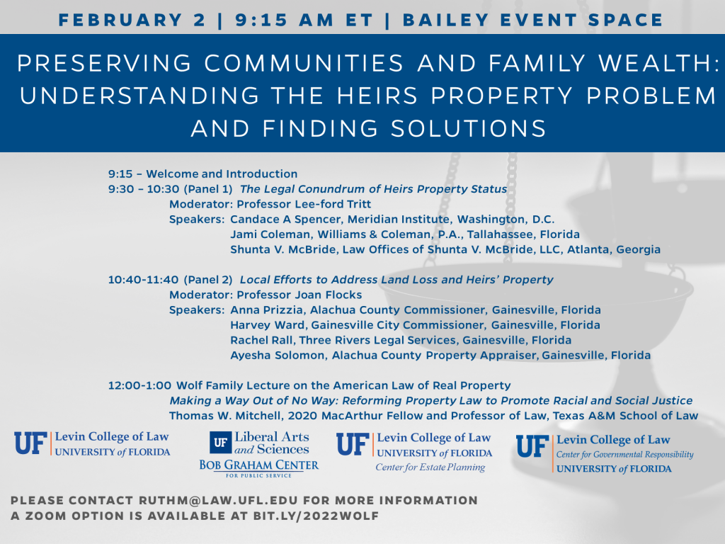 This conference explores how wealth and property is lost in low-income and minority communities through a lack of estate planning. When property owners die intestate or without valid wills, their real property is more likely to be subject to foreclosure, lost through tax deed sale, or descend into the legal limbo of heirs’ property status. The first panel includes experts on heirs’ property who will analyze the complex legal issues that arise when real property is not quickly probated. The second panel consists of local community leaders who are envisioning the connections between development, gentrification, and the racial wealth gap and seeking solutions to wealth and property loss in our community. This event is also being livestreamed on Zoom. Please contact ruthm@law.ufl.edu for more information.