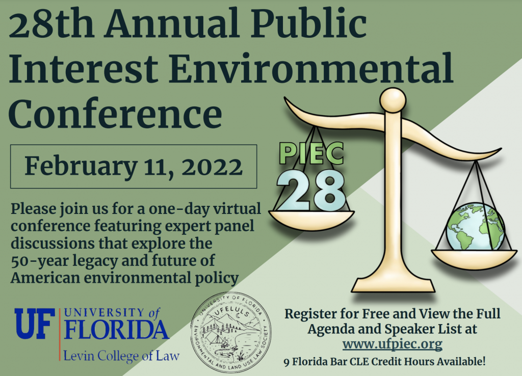 Please join the University of Florida Levin College of Law for Fifty Years of Environmental Law. This event is a one day virtual conference and is eligible for 9 CLE credits offered by the Florida Bar. For more information and to register, please visit UF PIEC. Please contact ruthm@law.ufl.edu for more information.
