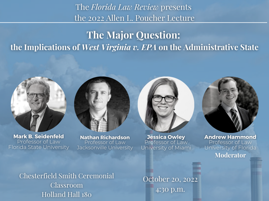 The Florida Law Review presents the 2022 Allen L. Poucher Lecture with Jessica Owley, Professor of Law, University of Miami School of Law; Nathan Richardson, Professor of Law, Jacksonville University College of Law; and Mark B. Seidenfeld, Patricia A. Dore Professor of Administrative Law, Florida State University College of Law. Andrew Hammond, Associate Professor of Law, University of Florida Levin College of Law, moderates. Please contact ruthm@law.ufl.edu for more information.
