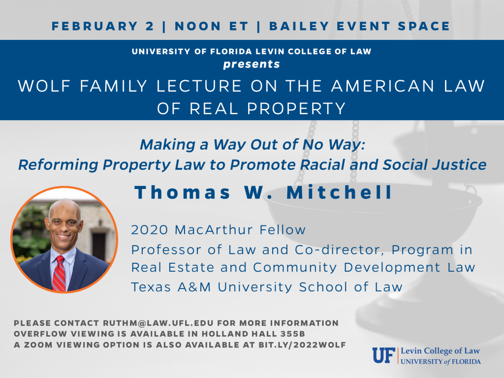 Thomas W. Mitchell, 2020 MacArthur Fellow and Professor of Law, Texas A&M School of Law, presents Making a Way Out of No Way: Reforming Property Law to Promote Racial and Social Justice. Please contact ruthm@law.ufl.edu for more information.