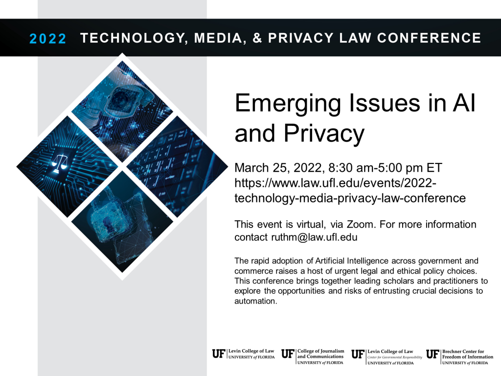 This year’s theme is Emerging Issues in AI and Privacy. This free conference has been approved for 7 General CLE credits and 7 Technology CLE credits by The Florida Bar. Please contact ruthm@law.ufl.edu for more information.
