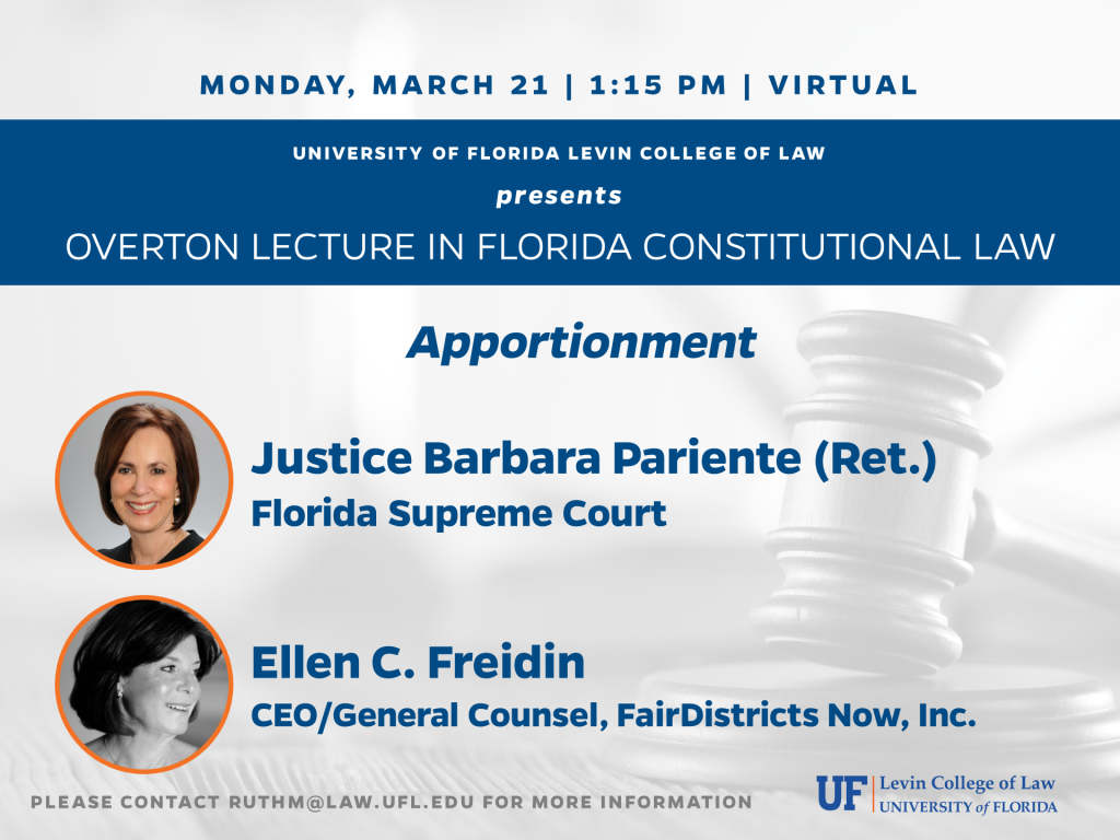 Justice Barbara Pariente, Florida Supreme Court (ret.), and Ellen C. Freidin, CEO and General Counsel, FairDistricts Now, Inc. presents. Please contact ruthm@law.ufl.edu for more information.