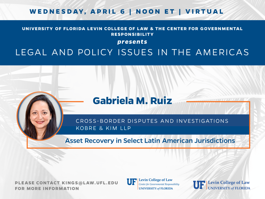 Gabriela M. Ruiz, Kobre & Kim LLP, presents Asset Recovery in Select Latin American Jurisdictions. Please contact kings@law.ufl.edu for more information.
