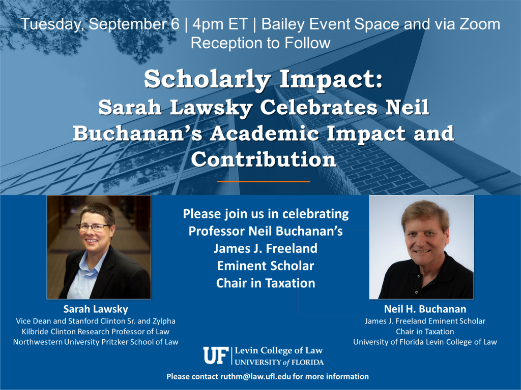 Please join Sarah B. Lawsky, Vice Dean and Stanford Clinton Sr. and Zylpha Kilbride Clinton Research Professor of Law, Northwestern University Pritzker School of Law, as she celebrates University of Florida Levin College of Law Professor Neil H. Buchanan’s James J. Freeland Eminent Scholar Chair in Taxation. Professor Buchanan will also provide remarks, followed by an opportunity for Q&A. You may join the event via Zoom. Please contact ruthm@law.ufl.edu for more information. Reception to follow; please RSVP here.