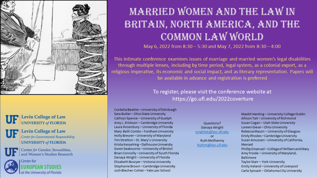 The University of Florida, Levin College of Law is hosting a conference on all aspects of coverture, broadly defined. This intimate conference will enable the participants to consider issues of marriage and married women’s legal disabilities through multiple lenses, including by time period, legal system, as a colonial export, its economic and social impacts, as literary representations, and many others. If you are working on aspects of married women’s legal incapacities in the common-law world, please consider submitting a paper. Accommodations for panelists during the conference will be covered. Publication opportunity may be available. Sponsored by UF Levin College of Law, UF Law’s Center for Governmental Responsibility, and the UF Center for Gender, Sexualities, and Women’s Studies Research. Please contact ruthm@law.ufl.edu for more information.