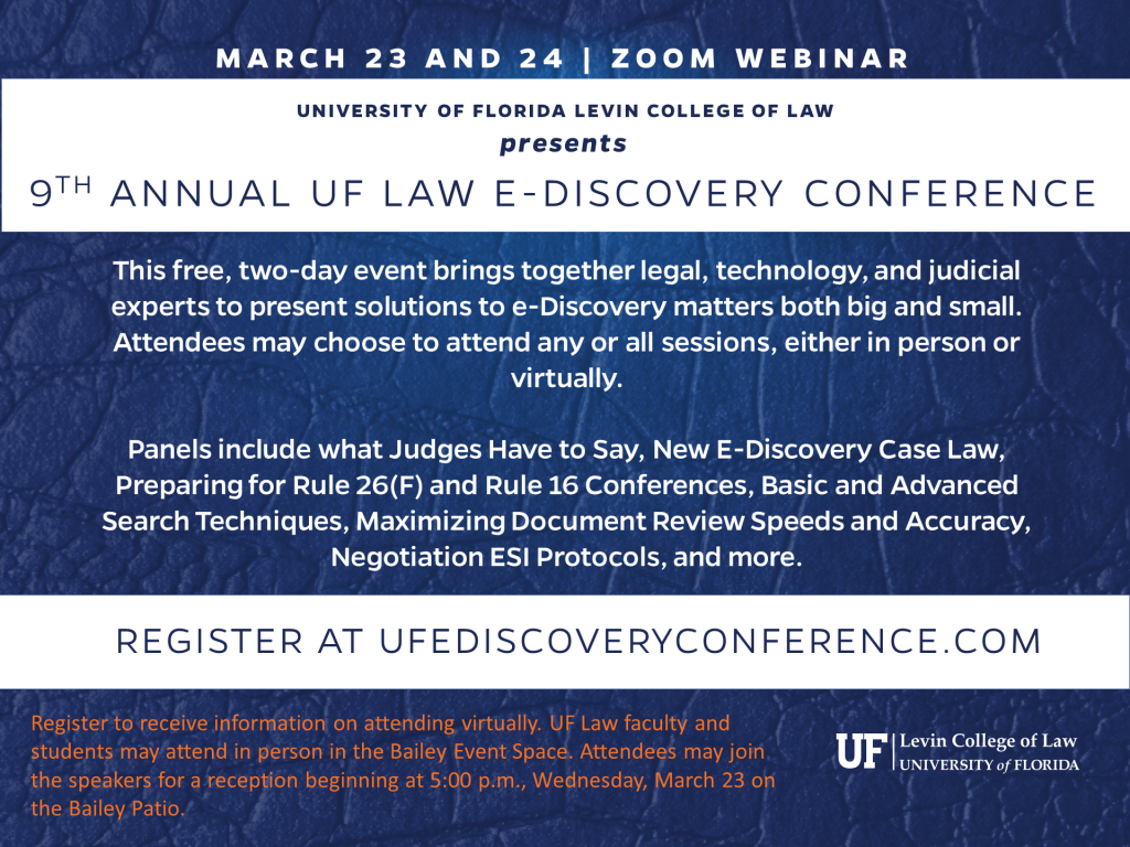 The UF Law E-Discovery Conference is being held virtually over two days this year. Please register for this free event here.