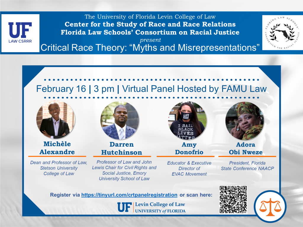 Michèle Alexandre, Dean and Professor of Law, Stetson University College of Law; Darren Hutchinson, Professor of Law and John Lewis Chair for Civil Rights and Social Justice, Emory University School of Law; Amy Donofrio, Educator and Executive Director of EVAC Movement; and Adora Obi Nweze, President, Florida State Conference of the NACCP; present. This event is co-sponsored by the University of Florida Levin College of Law, the Center for the Study of Race and Race Relations, and the Florida Law Schools’ Consortium on Racial Justice and hosted by Florida A&M University College of Law.