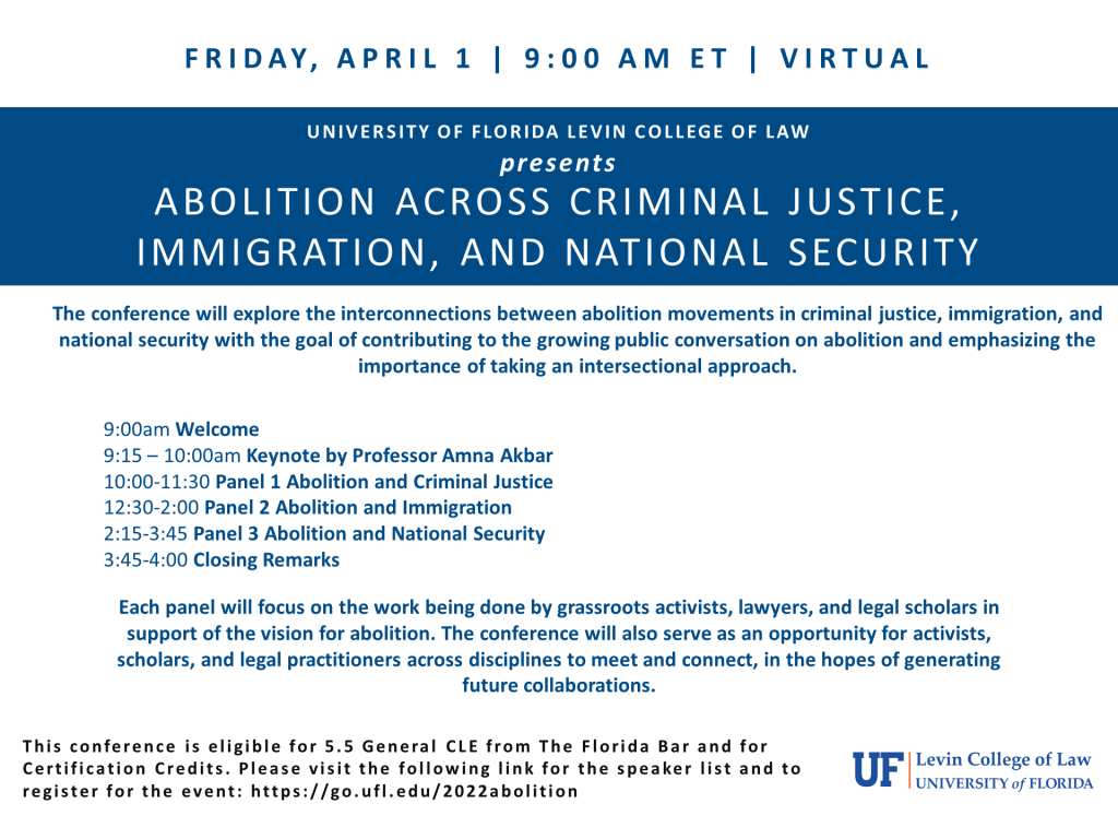 Together with a coalition of grassroots movement leaders, the University of Florida Levin College of Law is organizing a conference to explore the interconnections between abolition movements in the criminal law, immigration, and national security spaces. The conference’s goal is to contribute to the growing public conversation on abolition by emphasizing the importance of taking an intersectional approach. Each panel will focus on the work being done by grassroots activists, lawyers, and legal scholars in support of the vision for abolition within each space. Please contact ruthm@law.ufl.edu for more information.
