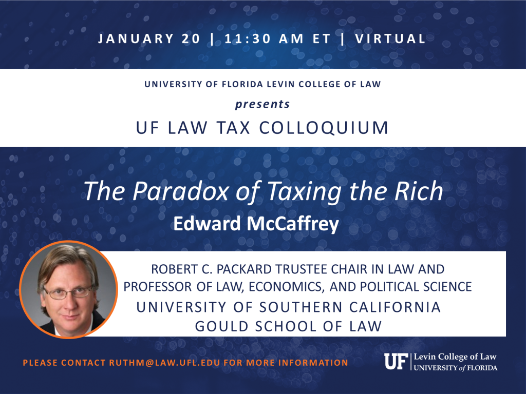 Edward McCaffrey, Robert C. Packard Trustee Chair in Law and Professor of Law, Economics and Political Science, University of Southern California Gould School of Law, presents. Please contact ruthm@law.ufl.edu for more information.