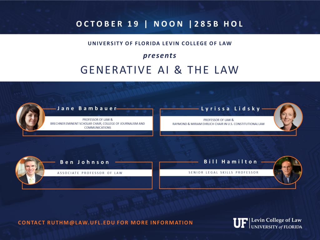 Please join Unviersity of Florida Levin College of Law faculty members Jane Bambauer, Professor of Law, Levin College of Law and Brechner Eminent Scholar Chair, College of Journalism and Communications; Lyrissa Barnett Lidsky, Raymond & Miriam Ehrlich Chair in U.S. Constitutional Law; Ben Johnson, Associate Professor of Law; and Bill Hamilton, Senior Legal Skills Professor for a discussion on Generative AI & the Law. Please contact ruthm@law.ufl.edu for more information.