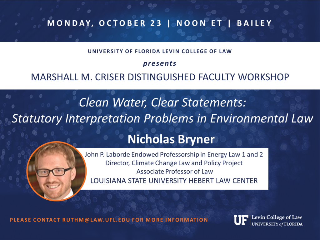 Nicholas Bryner, John P. Laborde Endowed Professorship in Energy Law 1 and 2, Director, Climate Change Law and Policy Project, and Associate Professor of Law; Louisiana State University Paul M. Hebert Law Center, presents. Please contact ruthm@law.ufl.edu for more information.