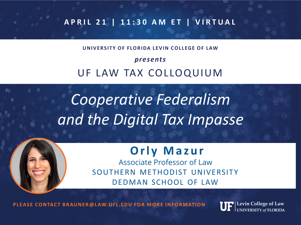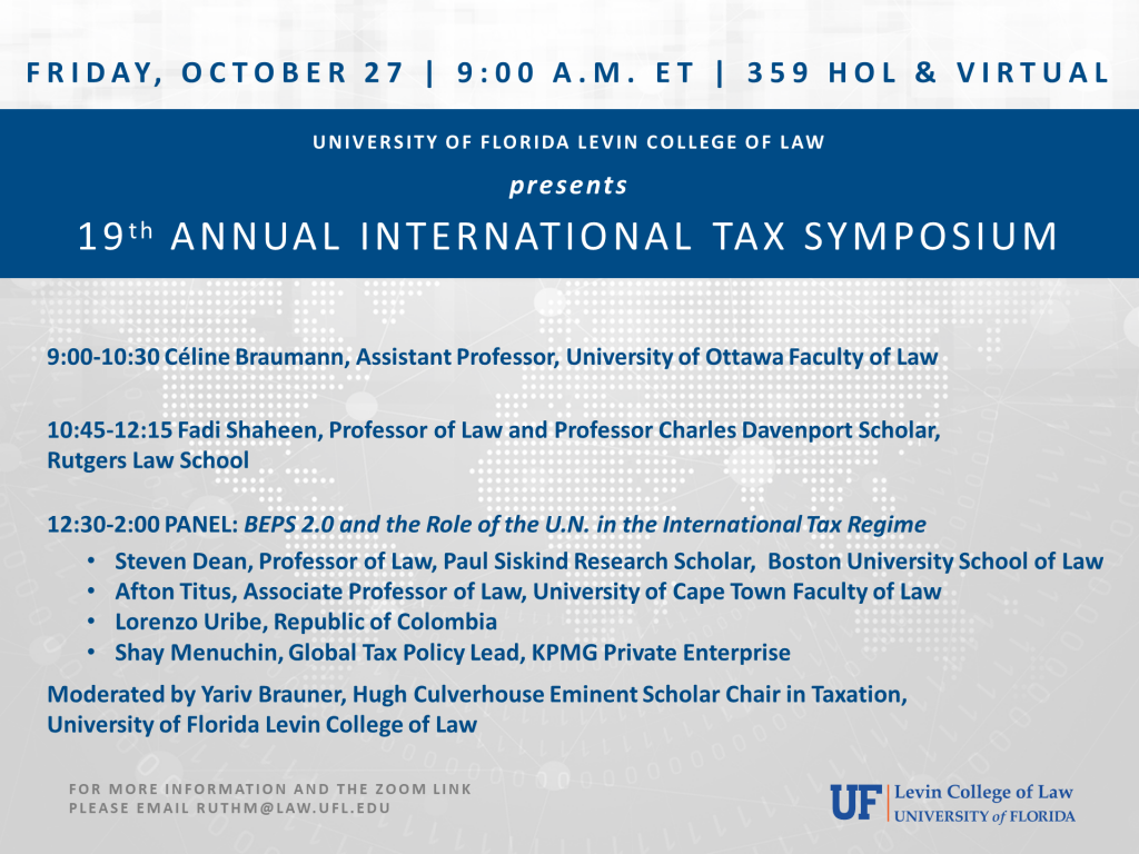 The University of Florida Levin College of Law and the Graduate Tax Program presents the 19th Annual International Tax Symposium. Please join presenters Céline Braumann, Assistant Professor, University of Ottawa Faculty of Law and Fadi Shaheen, Professor of Law and Professor Charles Davenport Scholar, Rutgers Law School. Yariv Brauner, Hugh Culverhouse Eminent Scholar Chair in Taxation, University of Florida Levin College of Law, moderates the panel discussion, BEPS 2.0 and the Role of the UN in the International Tax Regime, with Steven Dean, Professor of Law & Paul Siskind Research Scholar, Boston University School of Law; Afton Titus, Associate Professor of Law, University of Cape Town Faculty of Law; Lorenzo Uribe, Republic of Colombia Government; and Shay Menuchin, Global Tax Policy Lead, KPMG Private Enterprise. Please contact brauner@law.ufl.edu for more information and the Zoom link.