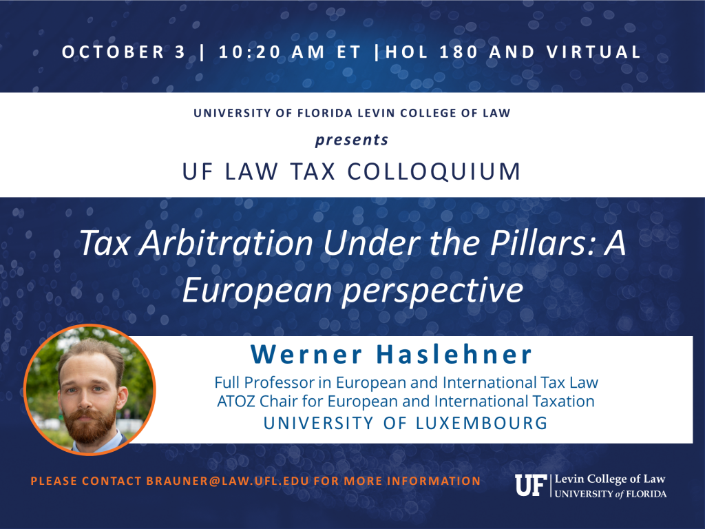 Werner Haslehner, Full Professor in European and International Tax Law, ATOZ Chair for European and International Taxation, University of Luxembourg Faculty of Law, Economics, and Finance, presents. Please contact ruthm@law.ufl.edu for more information.