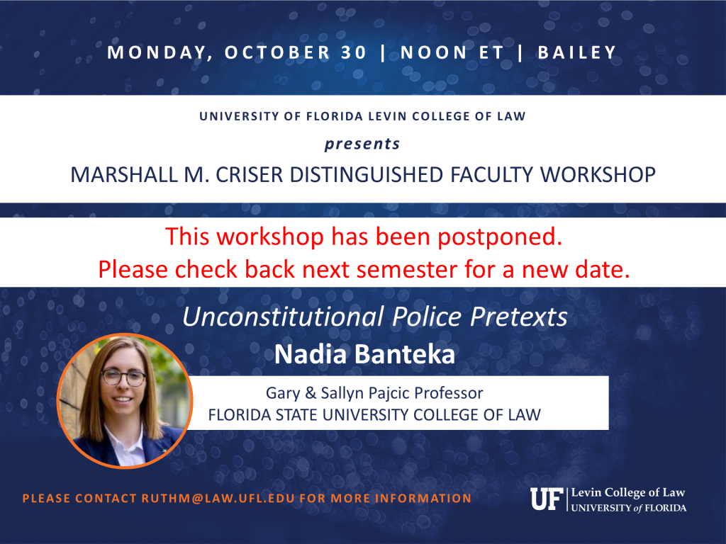 This event has been postponed until the spring semester. Please check our Spring 2024 Academic Workshop page for an update. Nadia Banteka, Gary & Sallyn Pajcic Professor, Florida State University College of Law; presents. Please contact ruthm@law.ufl.edu for more information.