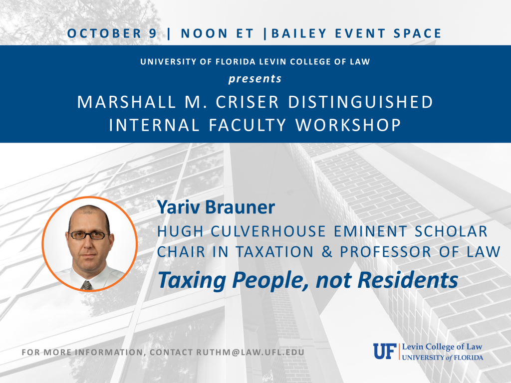 Yariv Brauner, Hugh Culverhouse Eminent Scholar Chair in Taxation, University of Florida Levin College of Law, presents. Please contact ruthm@law.ufl.edu for more information.