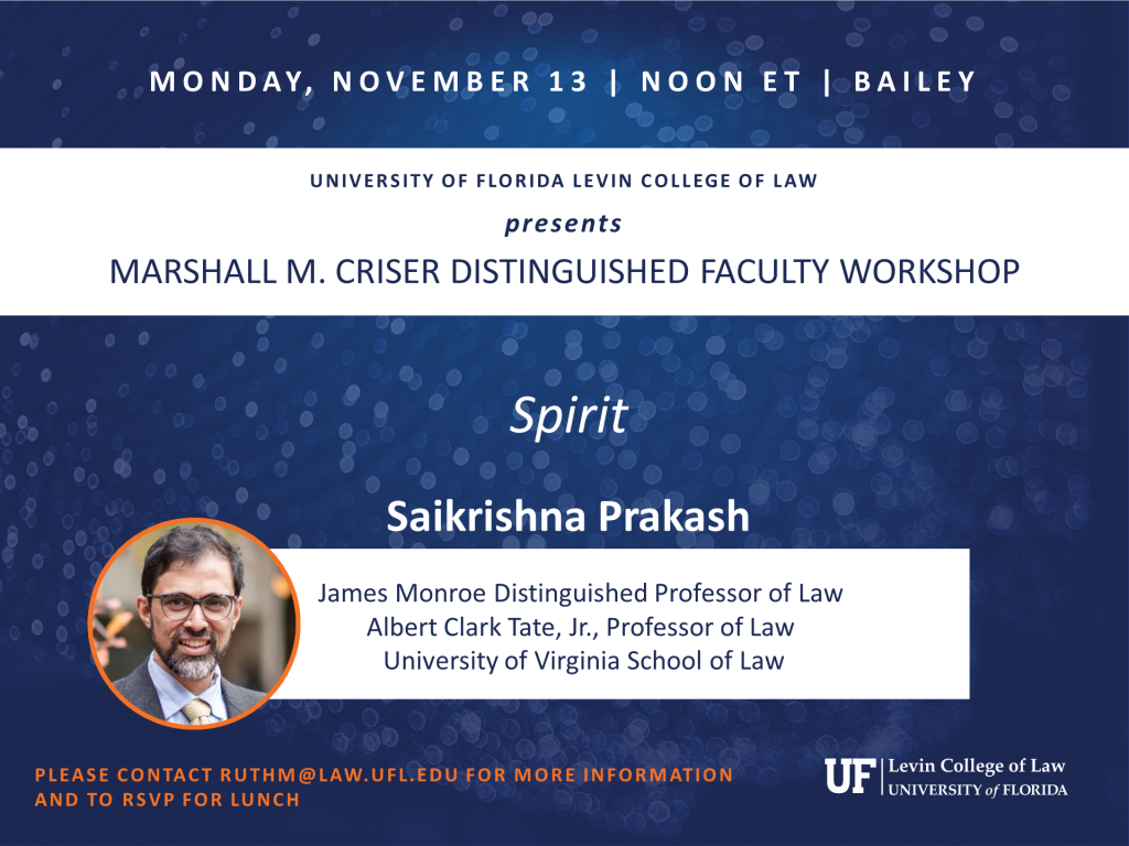 Saikrishna Prakash, James Monroe Distinguished Professor of Law and Albert Clark Tate, Jr., Professor of Law, University of Virginia School of Law, presents. Please contact ruthm@law.ufl.edu for more information.