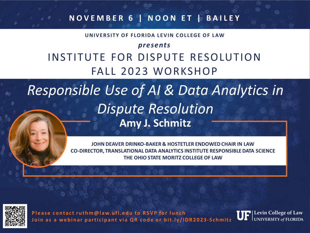 Amy Schmitz, Co-Director, Translational Data Analytics Institute Responsible Data Science, John Deaver Drinko-Baker & Hostetler Chair in Law, The Ohio State University Moritz College of Law, presents. Please contact ruthm@law.ufl.edu for more information.