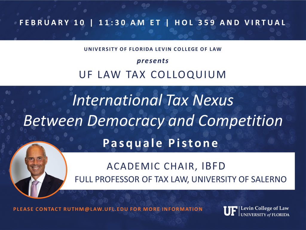 Pasquale Pistone, Global Professor of Law, New York University School of Law; Academic Chairman of IBFD (The Netherlands); Full Professor of Tax Law at the University of Salerno (Italy); and the Holder of a Jean Monnet ad Personam Chair in European Tax Law and Policy at WU Vienna (Austria); presents. Please contact ruthm@law.ufl.edu for more information.