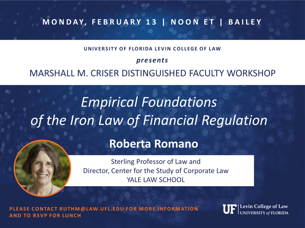 Roberta Romano, Sterling Professor of Law and Director, Yale Law School Center for the Study of Corporate Law, Yale Law School, presents. Please contact ruthm@law.ufl.edu for more information.