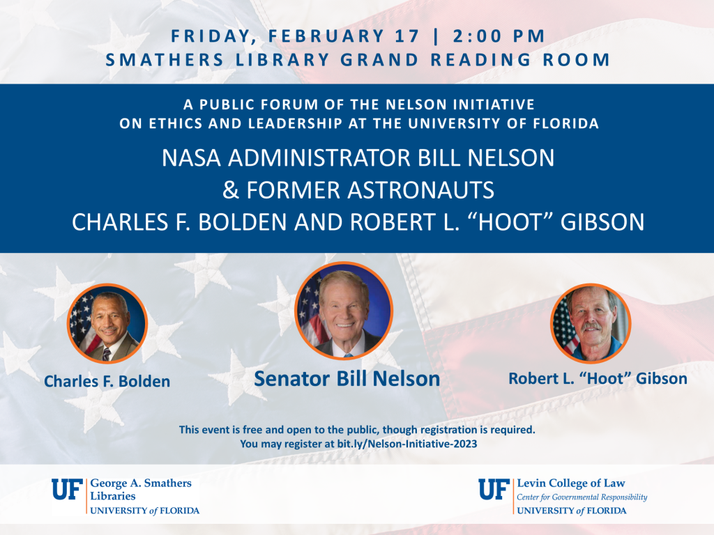 The George A. Smathers Libraries of the University of Florida and the Center for Governmental Responsibility of the University of Florida Levin College of Law present an event with NASA Administrator and former Senator Bill Nelson, Astronaut Charles F. Bolden, and Astronaut Robert L. “Hoot” Gibson. Registration is required. , Please contact ruthm@law.ufl.edu for more information.