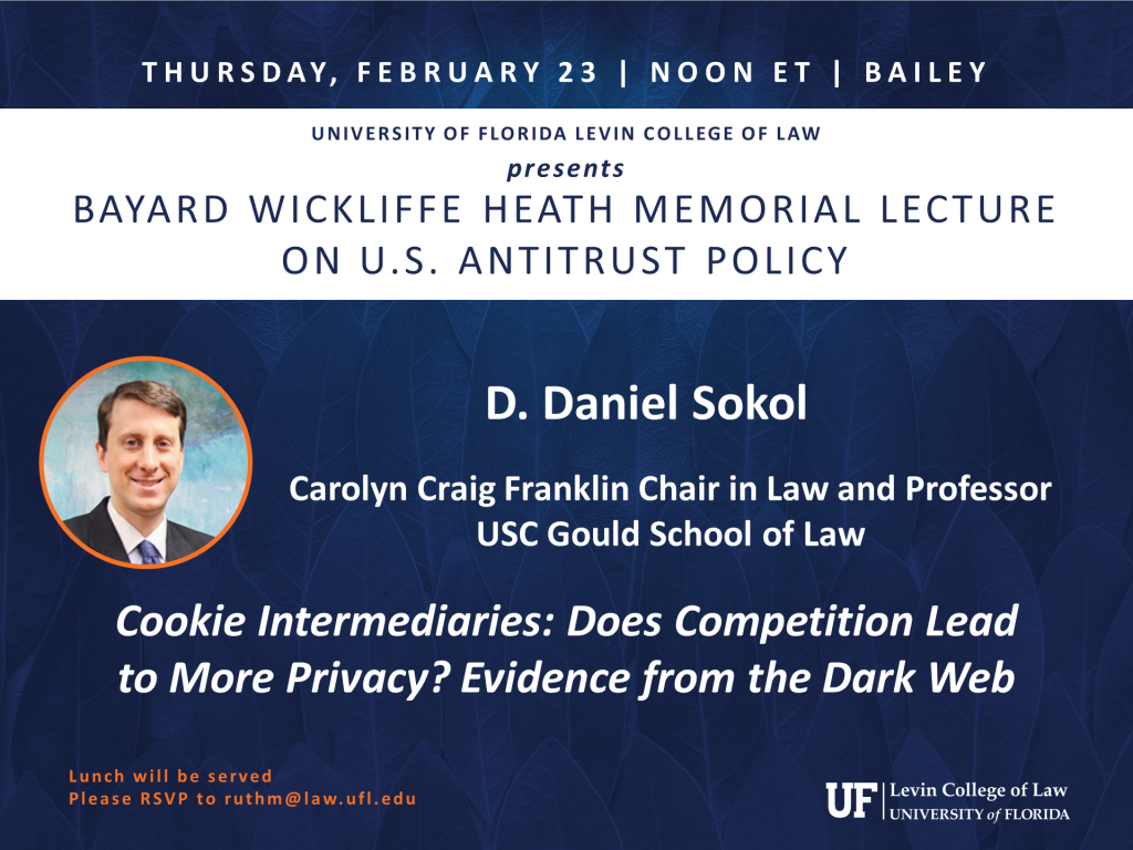 D. Daniel Sokol, Carolyn Craig Franklin Chair in Law and Business; Affiliate Professor of Business, Marshall School of Business, University of Southern California Gould School of Law, presents the 2023 Bayard Wickliffe Heath Memorial Lecture on U.S. Antitrust Policy. Please contact ruthm@law.ufl.edu for more information.