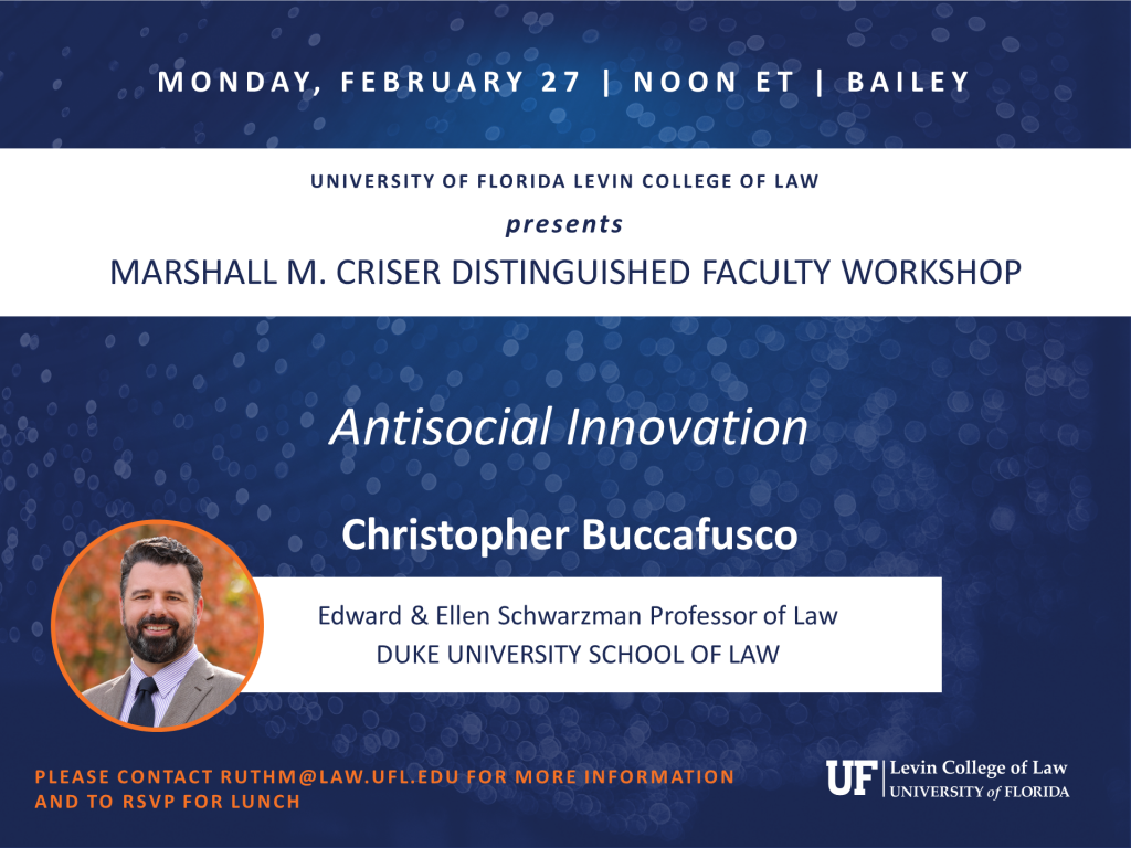 Christopher J. Buccafusco, Edward & Ellen Schwarzman Professor of Law, Duke University School of Law, presents. Please contact ruthm@law.ufl.edu for more information.