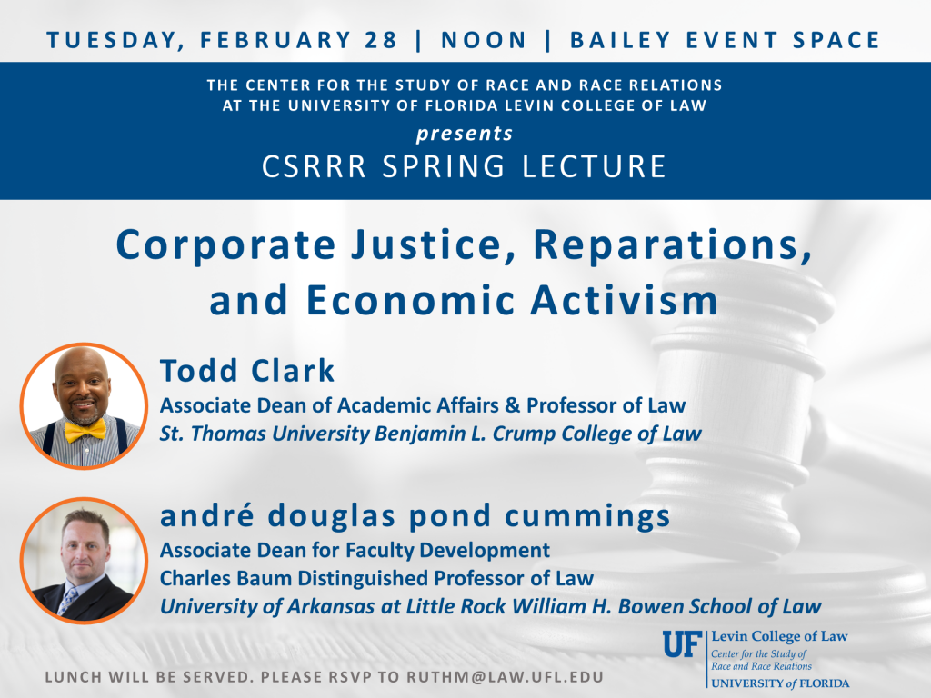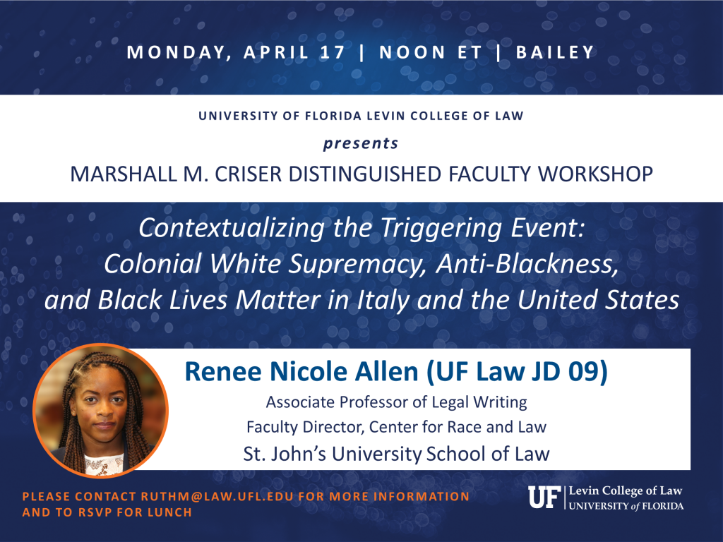 Renee Nicole Allen, Associate Professor of Legal Writing and Faculty Director, Center for Race and Law, St. John’s University School of Law; presents. Please contact ruthm@law.ufl.edu for more information.