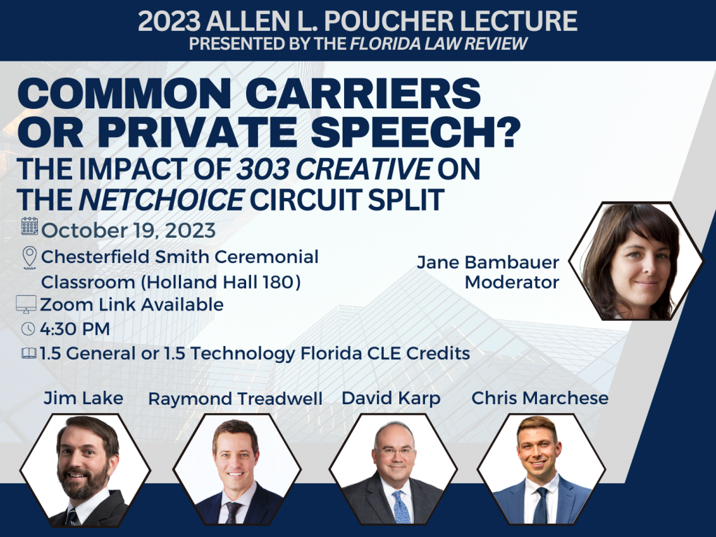 The Florida Law Review presents the 2023 Allen L. Poucher Lecture with Ray Treadwell, Partner, Lawson Huck Gonzalez PLLC; David Karp, Of Counsel, Carlton Fields; Chris Marchese, Director, Litigation Center at NetChoice; and James Lake, Partner, Thomas & LoCicero. Jane Bambauer, Professor of Law, Levin College of Law and Brechner Eminent Scholar Chair, College of Journalism and Communications moderates. Please contact visit Florida Law Review’s webpage for more information. Please register here.