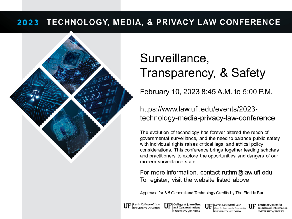 UF’s 2023 Technology, Media, and Privacy Law Conference will be held on February 10, 2023, with in-person and virtual options. This conference is free and has been approved for 8.5 General and 8.5 Technology CLEs by The Florida Bar. Please contact ruthm@law.ufl.edu for more information.