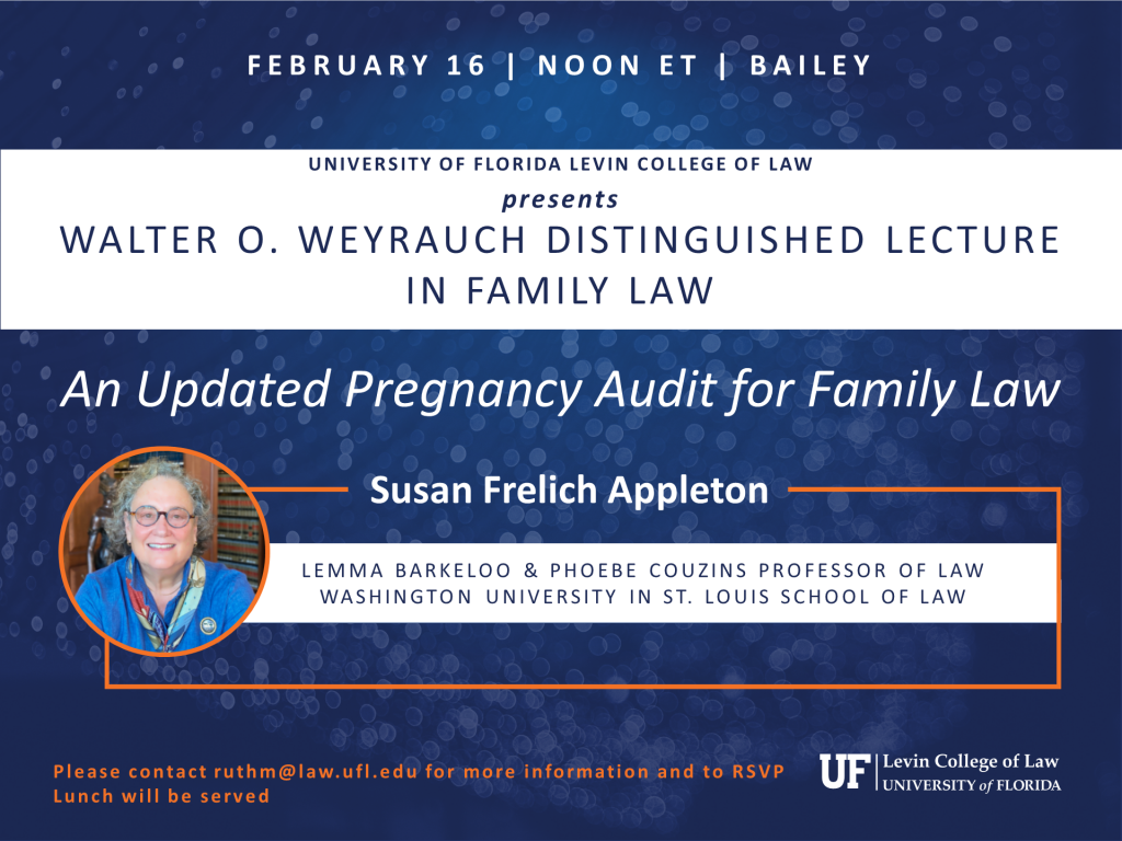 Susan Frelich Appleton, Lemma Barkeloo & Phoebe Couzins Professor of Law, Washington University in St. Louis School of Law, presents the 2023 Weyrauch Distinguished Lecture in Family Law. Please contact ruthm@law.ufl.edu for more information.
