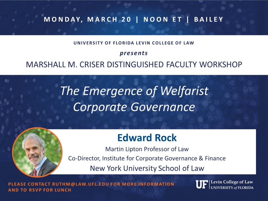 Edward Rock, Martin Lipton Professor of Law and Co-Director, Institute for Corporate Governance & Finance, New York University School of Law, presents. Please contact ruthm@law.ufl.edu for more information.
