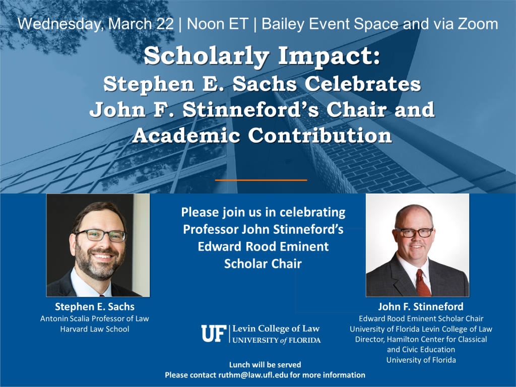 Please join Stephen Sachs, Antonin Scalia Professor of Law, Harvard Law School; as he celebrates University of Florida Levin College of Law Professor John F. Stinneford’s Edward Rood Eminent Scholar Chair. Professor Stinneford will also provide remarks, followed by an opportunity for Q&A. Lunch will be served. Please contact ruthm@law.ufl.edu for more information. You may join the event via Zoom.