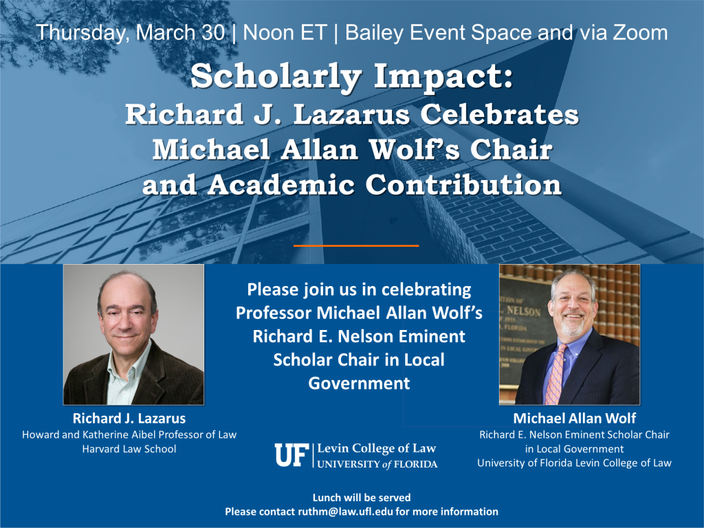 Please join Richard J. Lazarus, Howard and Katherine Aibel Professor of Law, Harvard Law School; as he celebrates University of Florida Levin College of Law Professor Michael Allan Wolf’s Richard E. Nelson Eminent Scholar Chair in Local Government. Professor Wolf will also provide remarks, followed by an opportunity for Q&A. Lunch will be served.Please contact ruthm@law.ufl.edu for more information. You may join the event via Zoom.