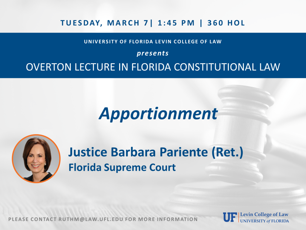 Justice Barbara Pariente (Ret.), Florida Supreme Court, presents. Please contact ruthm@law.ufl.edu for more information.
