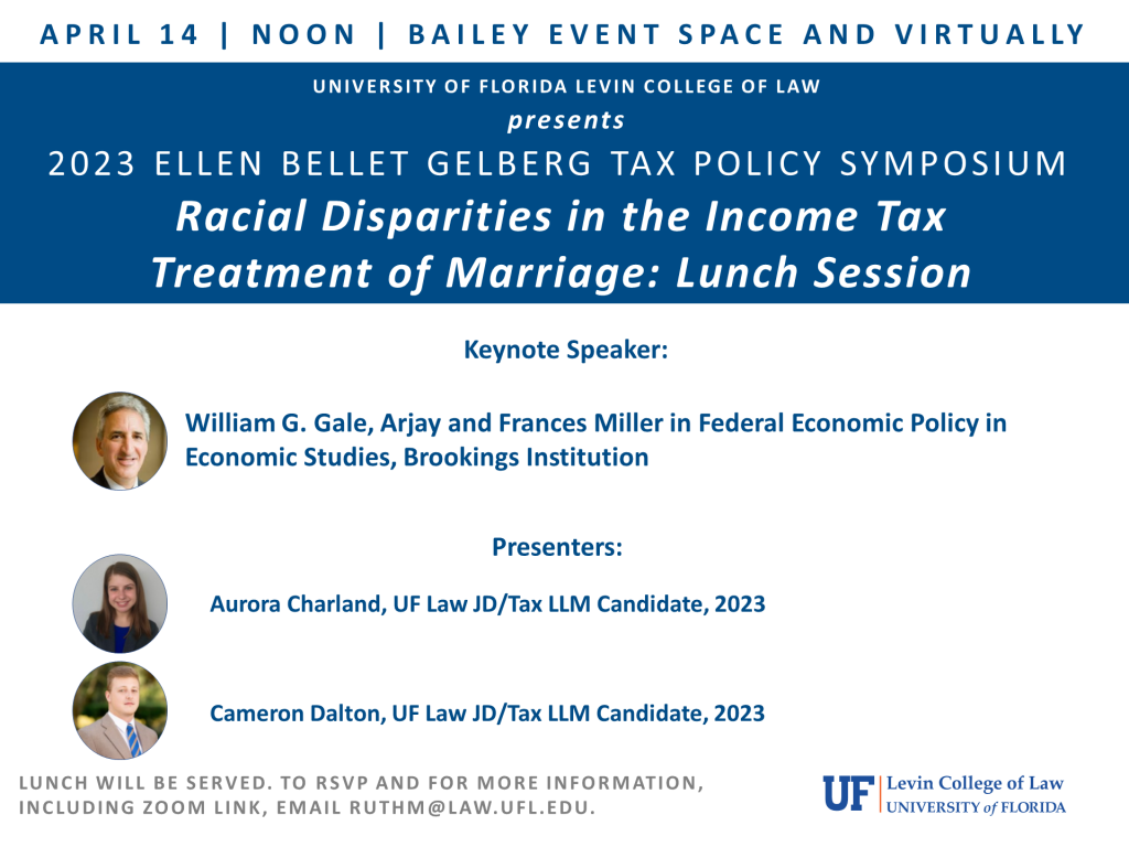William G. Gale, Arjay and Frances Fearing Miller Chair in Federal Economic Policy, Brookings Institution, will present the 2023 Ellen Bellet Gelberg luncheon keynote address, Racial Disparities in the Income Tax Treatment of Marriage. UF Law Graduate Tax students Aurora Charland and Cameron Dalton will also present. Please contact ruthm@law.ufl.edu for more information and to RSVP for lunch.