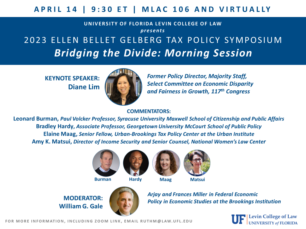 This year’s topic is Bridging the Divide. Please join keynote presenter Diane Lim, former Policy Director, Majority Staff, of the Select Committee on Economic Disparity and Fairness in Growth of the 117th Congress, with comments by Amy K. Matsui, Director of Income Security and Senior Counsel at the National Women’s Law Center; Elaine Maag, Senior Fellow, Urban-Brookings Tax Policy Center; Bradley Hardy, Associate Professor, Georgetown University McCourt School of Public Policy; and Leonard Burman, Institute Fellow, Urban-Brookings Tax Policy Center. The event is moderated by William G. Gale, Arjay and Frances Fearing Miller Chair in Federal Economic Policy, Brookings Institution. Please contact ruthm@law.ufl.edu for more information.