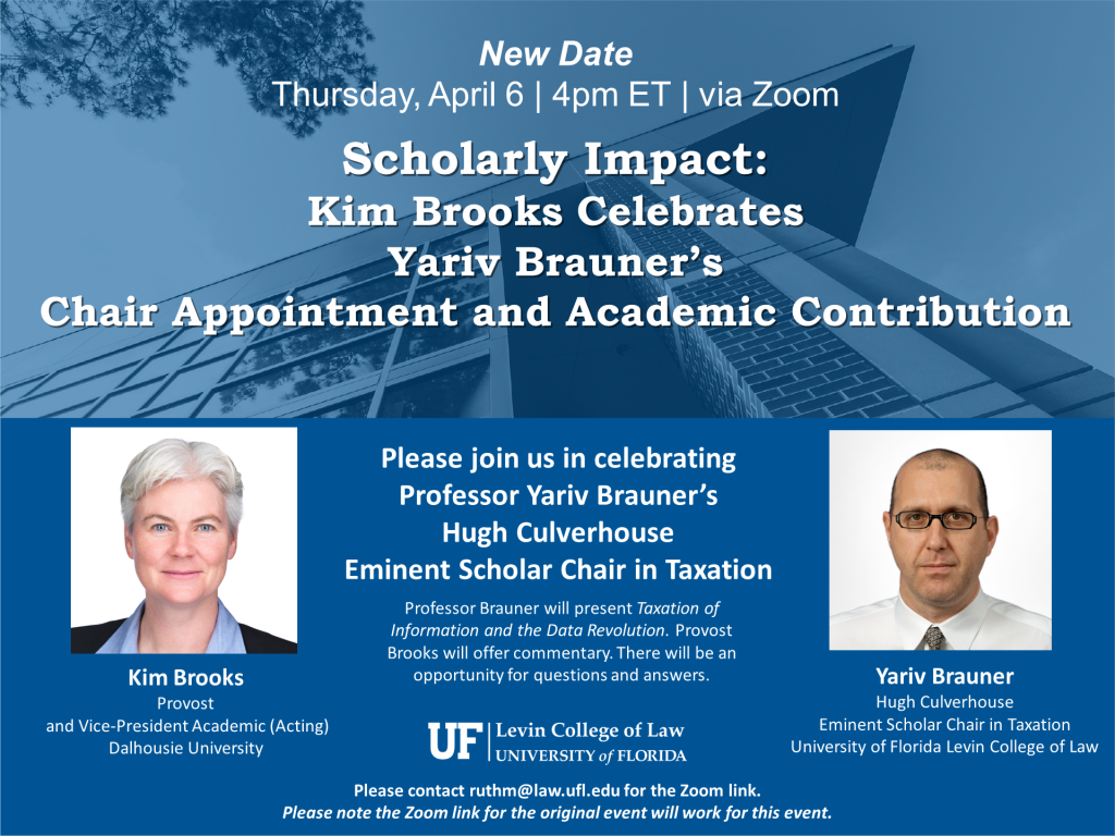 Please note this event will now be held on April 6 at 4pm. Please join Kim Brooks, Provost and Vice-President Academic (Acting), Dalhousie University, as she celebrates University of Florida Levin College of Law Professor Yariv Brauner’s Hugh Culverhouse Eminent Scholar Chair in Taxation. Professor Brauner will present a work in progress, followed by remarks by Provost Brooks. There will be an opportunity for Q&A. You may join the event via Zoom. Please contact ruthm@law.ufl.edu for more information.