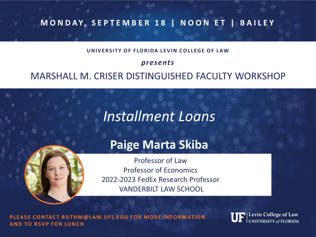 Paige Marta Skiba, Professor of Law, Professor of Economics, and 2022-2023 FedEx Research Professor, Vanderbilt Law School, presents. Please contact ruthm@law.ufl.edu for more information.
