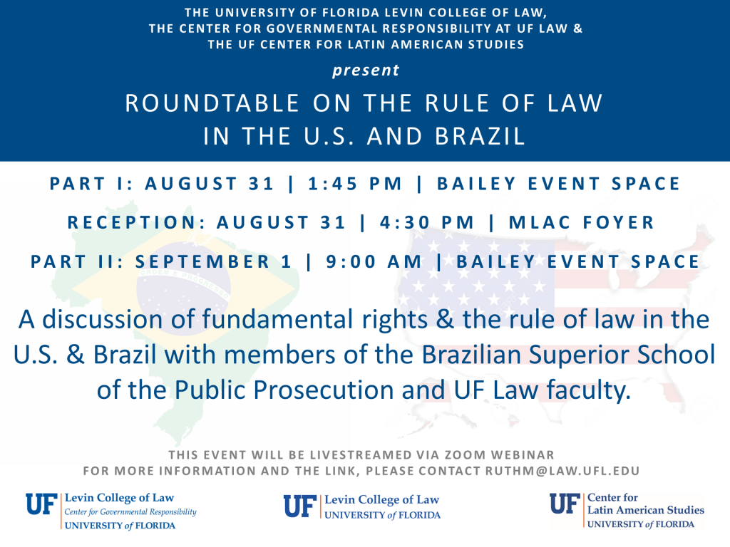 The University of Florida Levin College of Law, the Center for Governmental Responsbility at UF Law, and the Center for Latin American Studies at the University of Florida invite you to join Brazilian federal prosectuors and faculty from the UF Levin College of Law as they discuss the status of fundamental rights and the rule of law in the U.S. and Brazil. This event takes place over two days. Panel I convenes on Thursday, August 31 at 1:45 p.m. and Panel II convenes on Friday, September 1 at 9:30 a.m. A reception will be held on August 31 at 4:30 p.m. in the Martin Levin Advocacy Center foyer. Please contact ruthm@law.ufl.edu for more information.