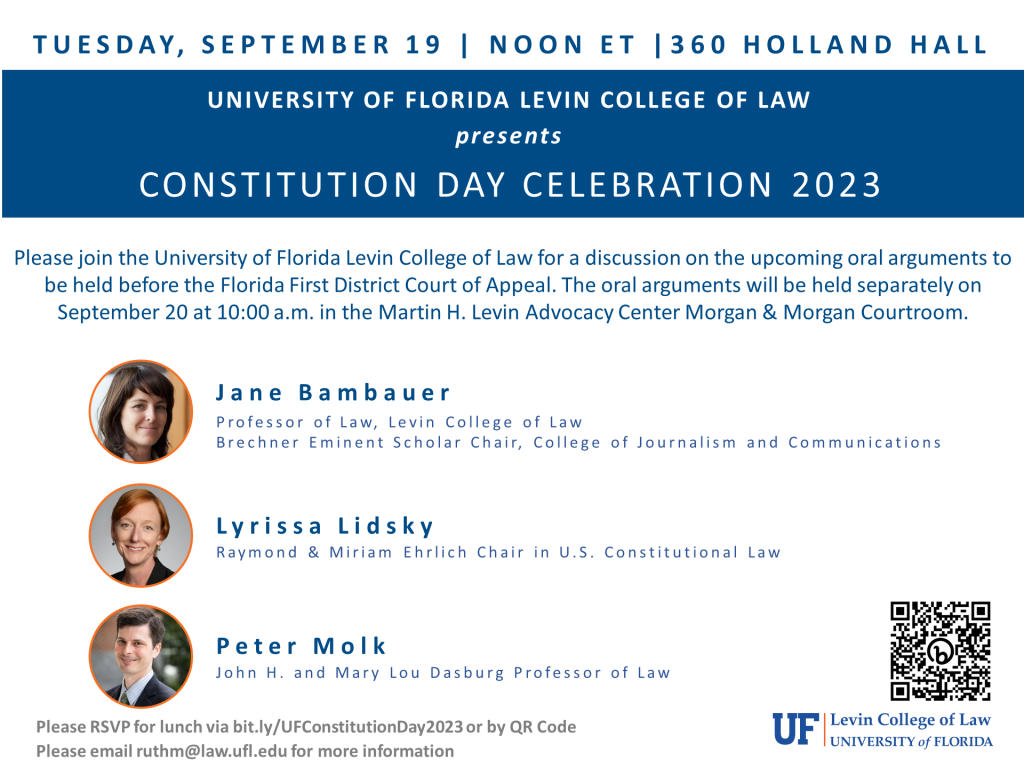 Please join the University of Florida Levin College of Law for our 2023 Constitution Day Celebration. Jane Bambauer, Professor of Law, Levin College of Law and Brechner Eminent Scholar Chair, College of Journalism and Communications; Lyrissa Barnett Lidsky, Raymond & Miriam Ehrlich Chair in U.S. Constitutional Law; and Peter Molk, Associate Dean for Research and Faculty Development and John H. and Mary Lou Dasburg Professor; will discuss the upcoming oral arguments to be held before the Florida First District Court of Appeal. The oral arguments will be held separately on September 20 at 10:00 a.m. in the Martin H. Levin Advocacy Center Morgan & Morgan Courtroom. You may find briefs for the oral arguments here. Lunch will be served. Please RSVP here and contact ruthm@law.ufl.edu for more information.